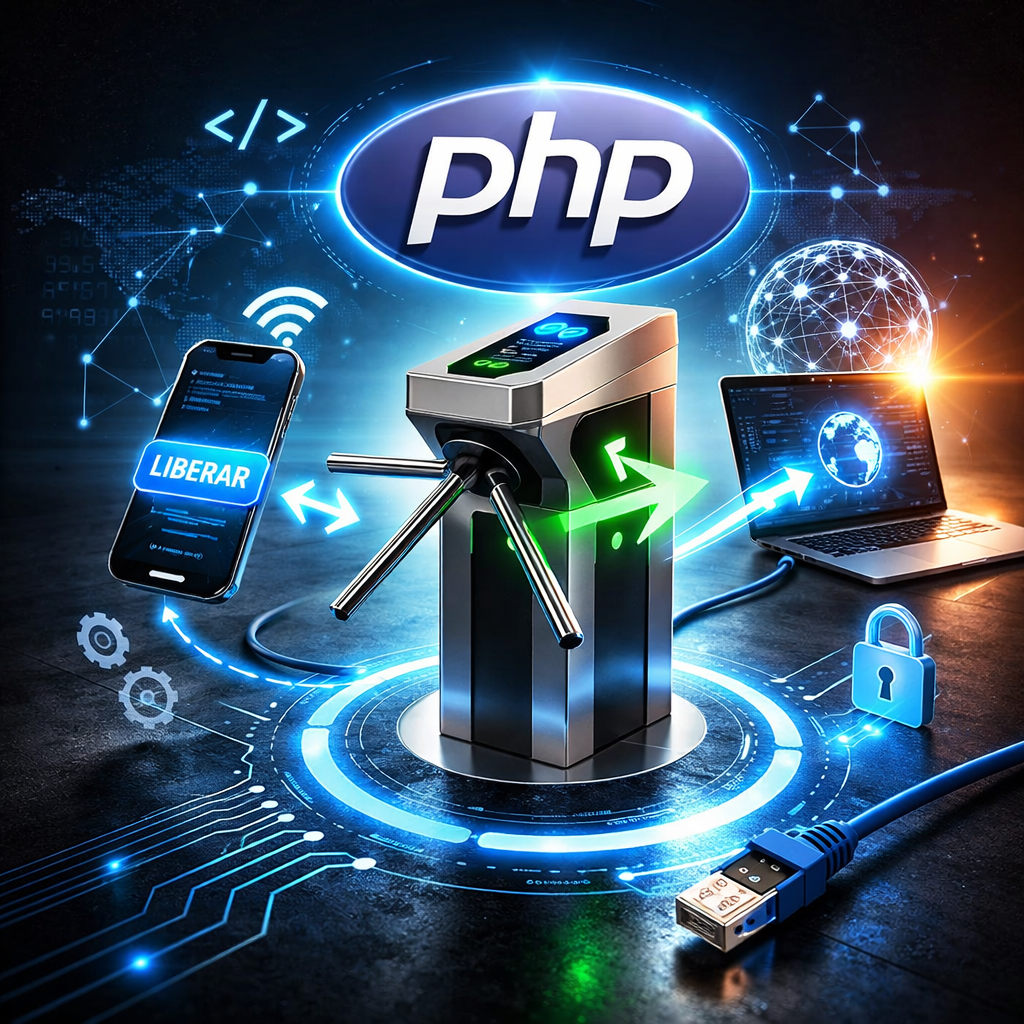 O script se conecta ao IP e porta da catraca usando sockets (fsockopen);